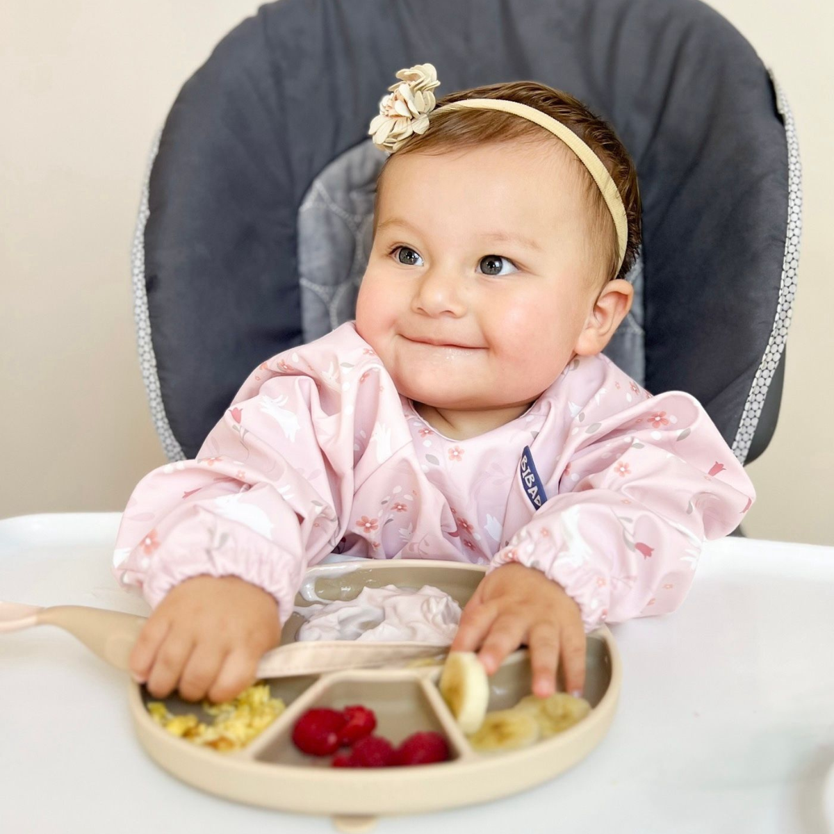 The No.1 Coverall Weaning Bib.  Helping them learn vital feeding skills and achieve key developmental milestones