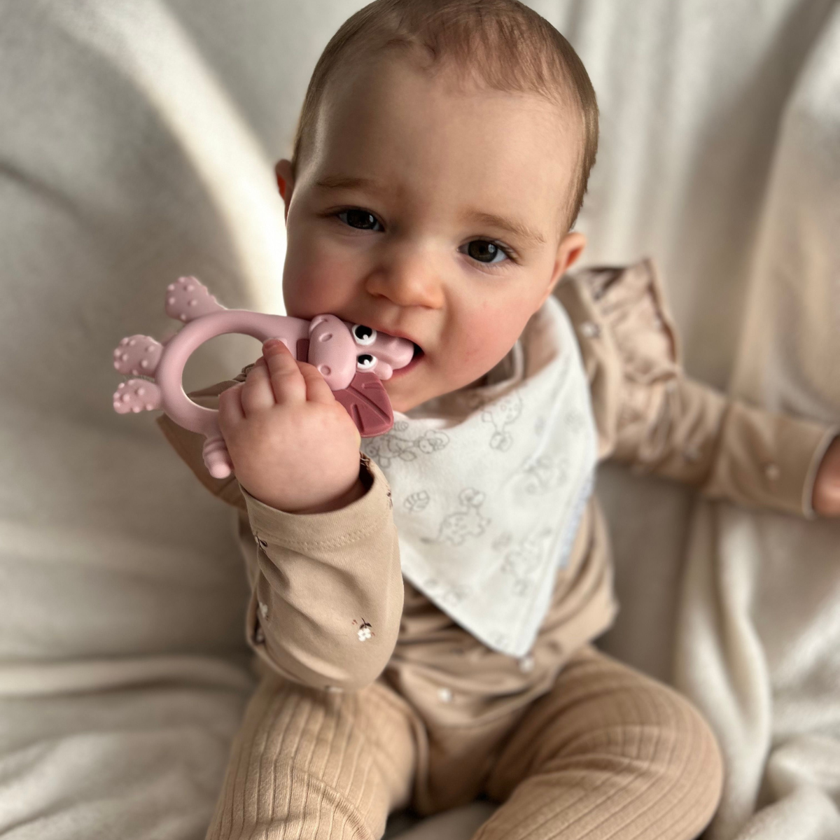 “Dotty has helped my little girl so much with her teething! I love how she has 5 different textures to chew rather than just one. My little girl never gets bored of Dotty, she is the cutest dino!”