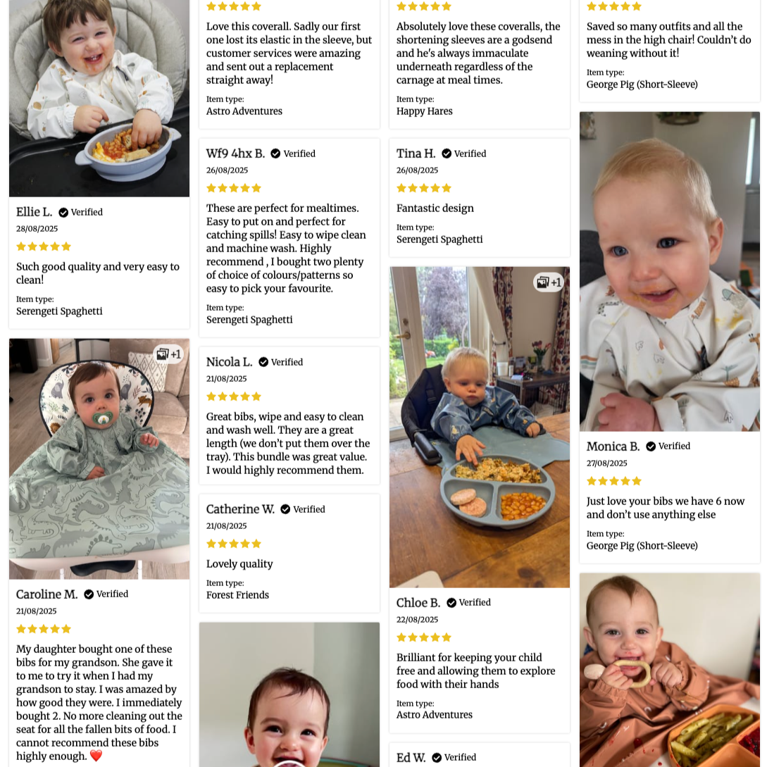 Bibado was founded by real parents searching for a solution for messy mealtimes. When we started weaning, we tried countless bib styles and brands, but nothing came close when it concerned keeping our kids covered and our weaning woes under control.